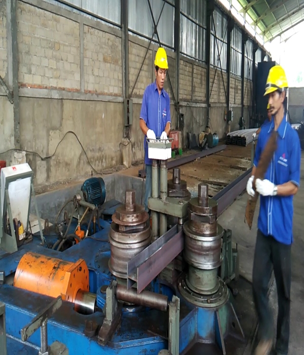 Mesin bending besi terdiri dari 3 poros roll yang mana pada 2 poros dapat diatur untuk maju mundur sesuai radius profil bending.